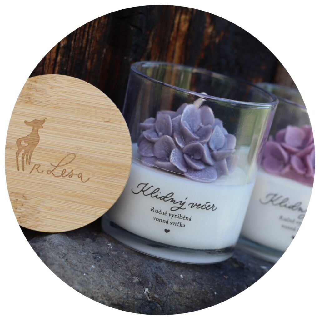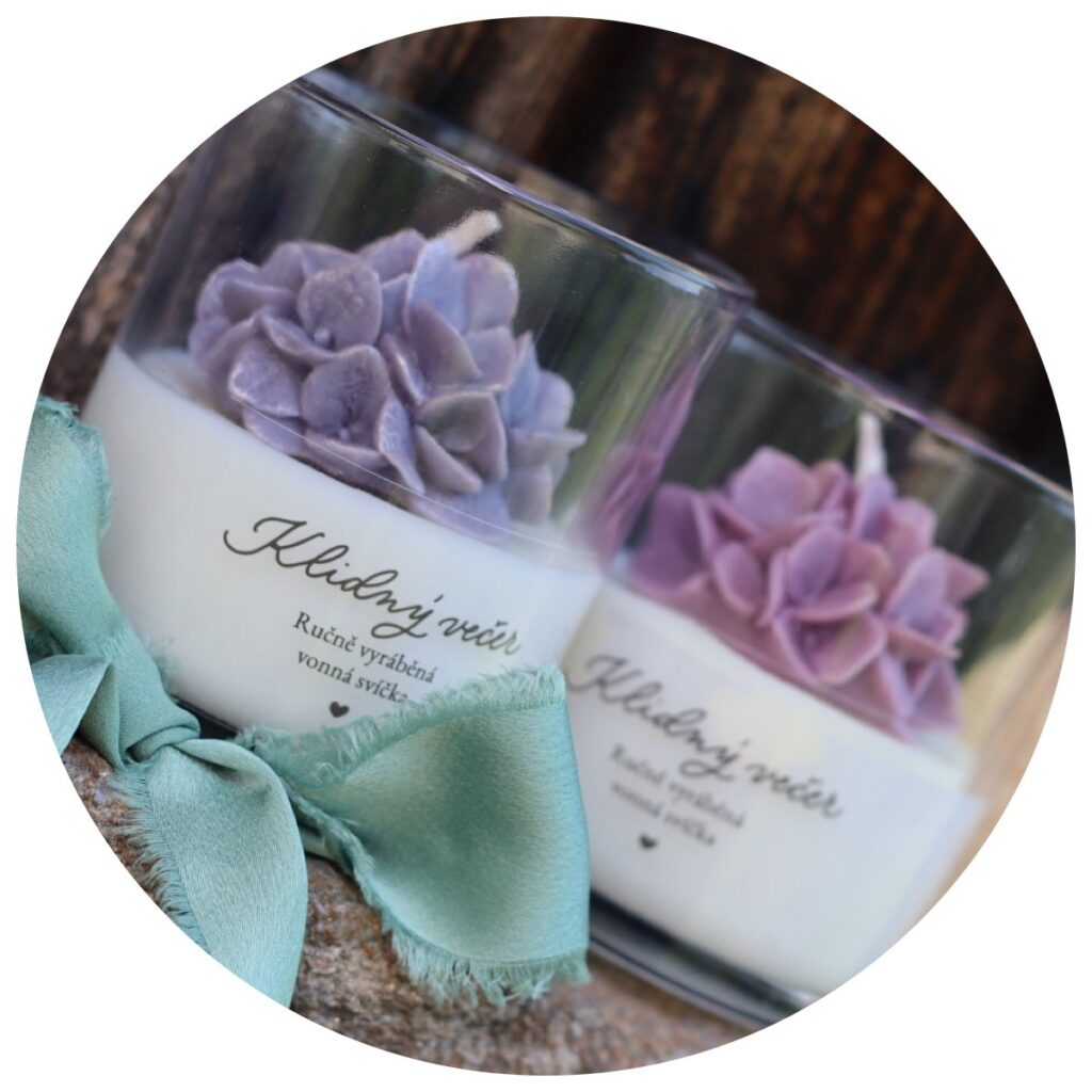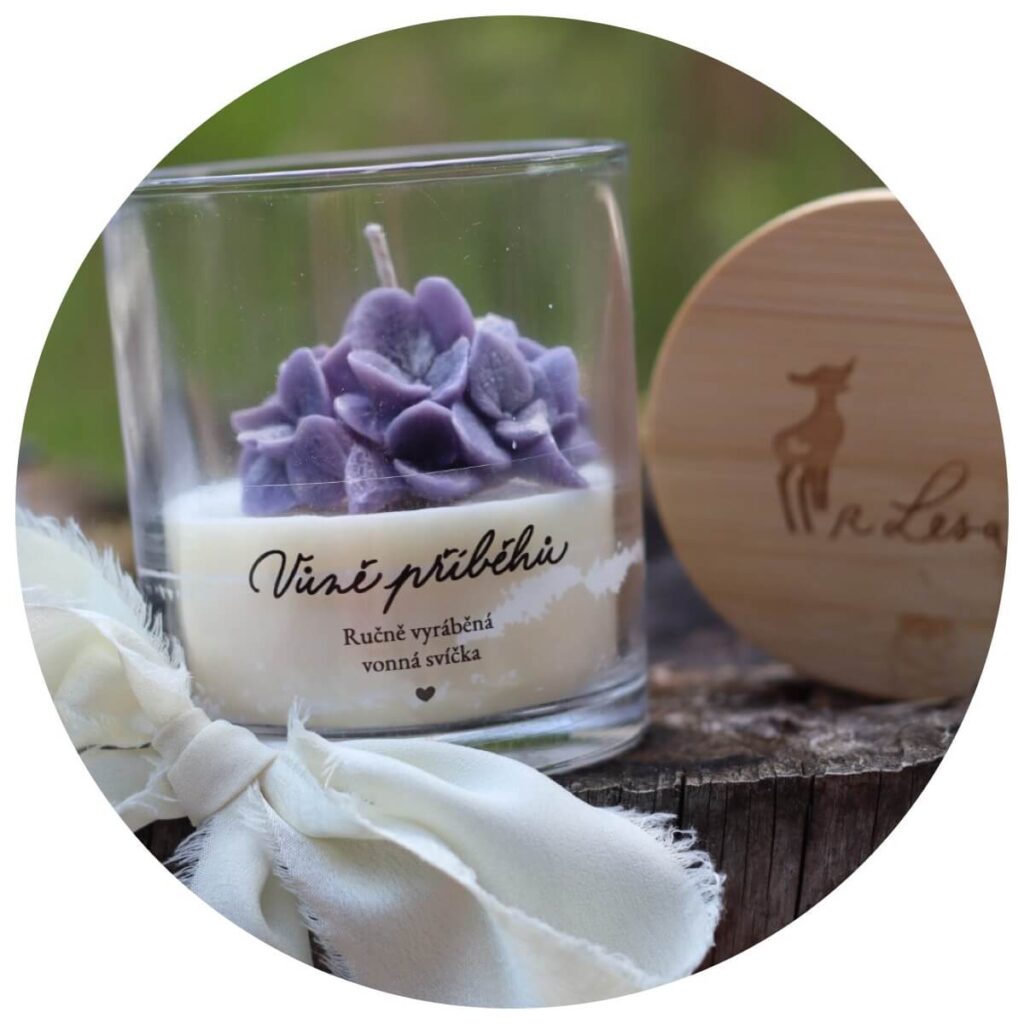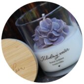 ručně vyráběná svíčka s květem Hortenzie sójový a včelí vosk, víčko s gravírovaným logem 300 ml